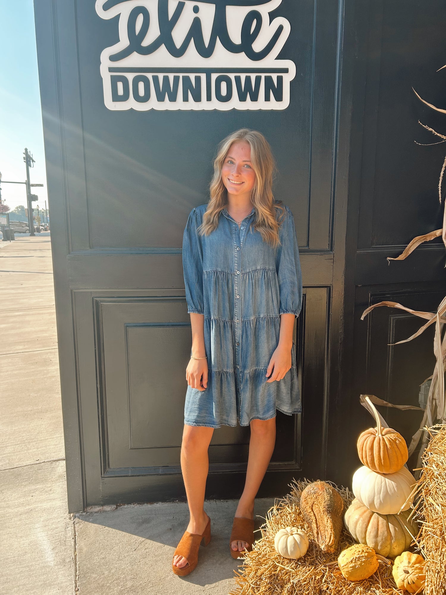 3/4 SLEEVE WOVEN WASHED CHAMBRAY TIERED BUTTON DOWN DRESS WITH POCKETS
