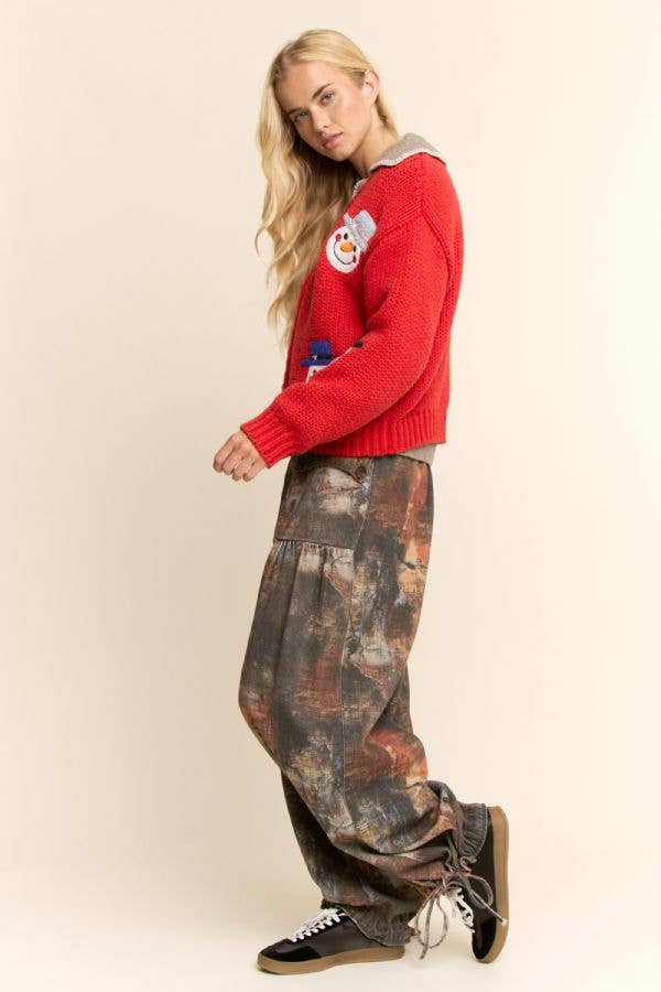 Bring festive charm to your boutique with this cozy red cardigan featuring playful snowman appliques. A whimsical yet wearable holiday statement, it is crafted with a relaxed fit, button front, and cheerful seasonal detail - perfect for boutique buyers seeking unique winter-ready styles that delight and sell through the season.