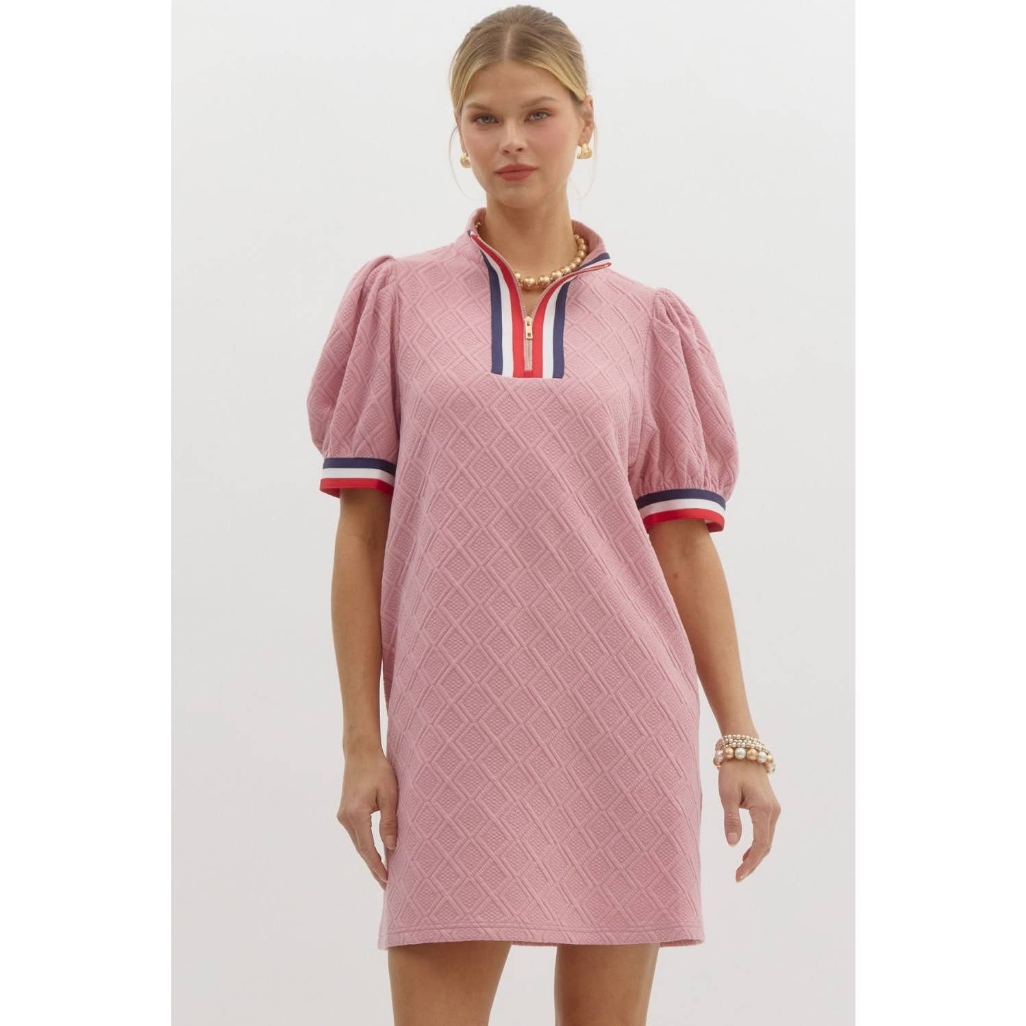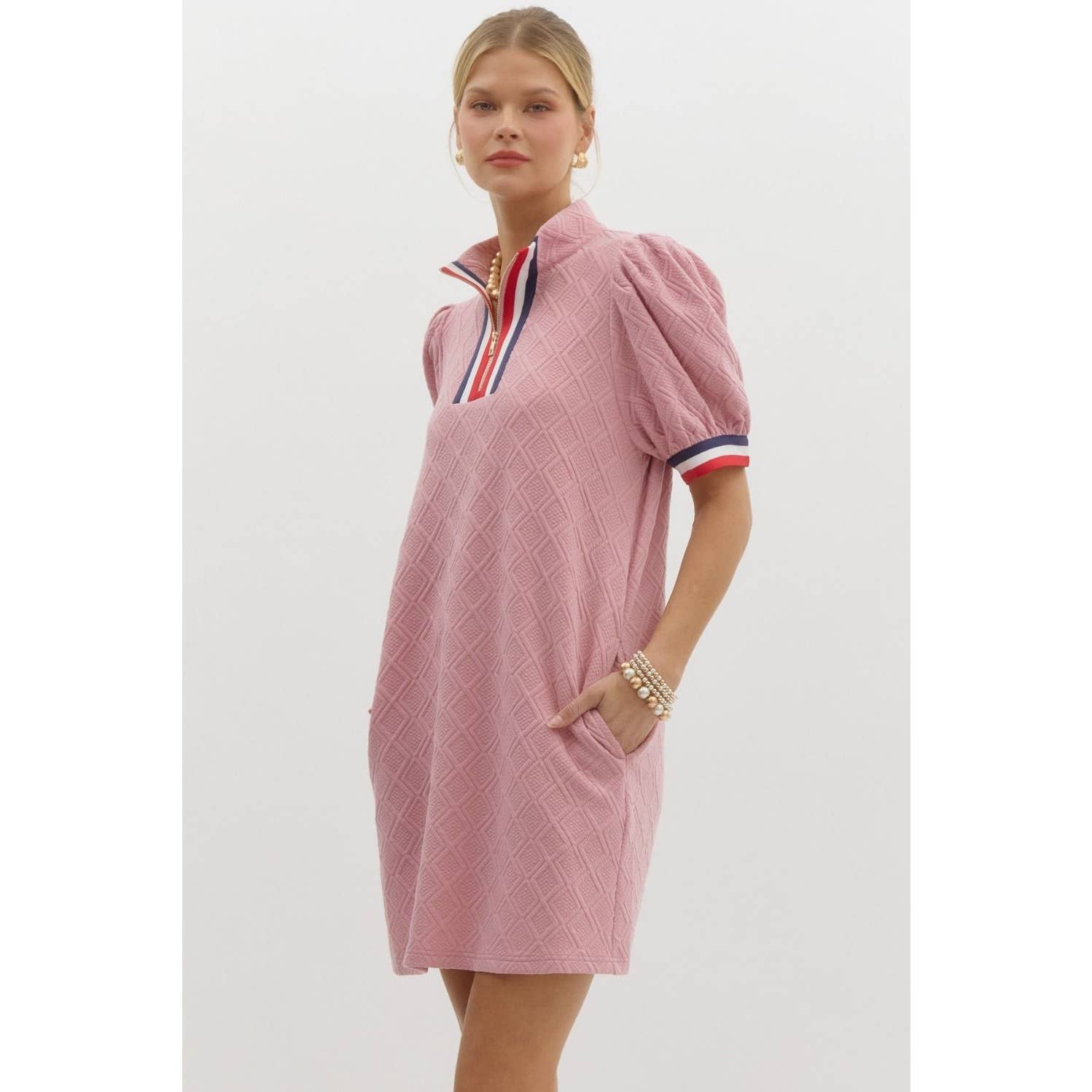- Solid diamond pattern textured knit pullover mini dress featuring accented multicolor band short puff sleeve and front half-zip closure. Pockets at side. Unlined. Knit. Non-sheer. Lightweight.